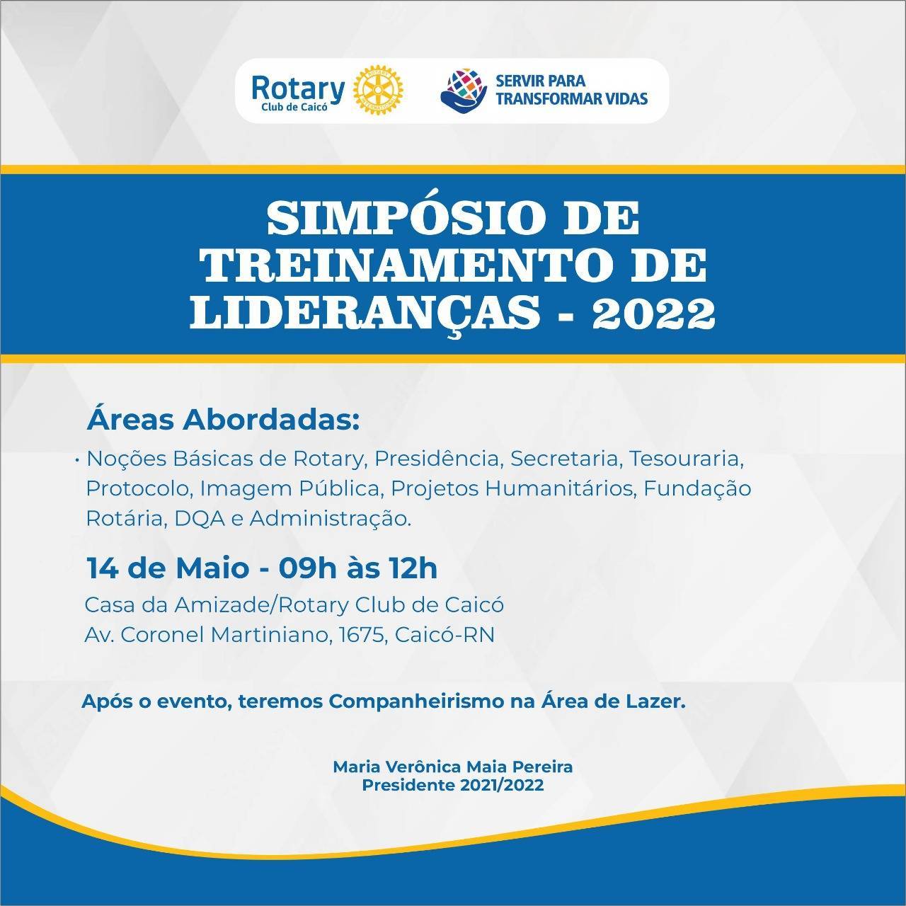O Rotary Club de Caicó estará realizando no sábado, dia 14 de maio o Simpósio de Treinamentos de Lideranças 2022. O evento terá início às 9 horas e segue até o meio-dia na Casa da Amizade, sede do Rotary Club, na Avenida Coronel Martiniano, 1675 no bairro Penedo em Caicó.