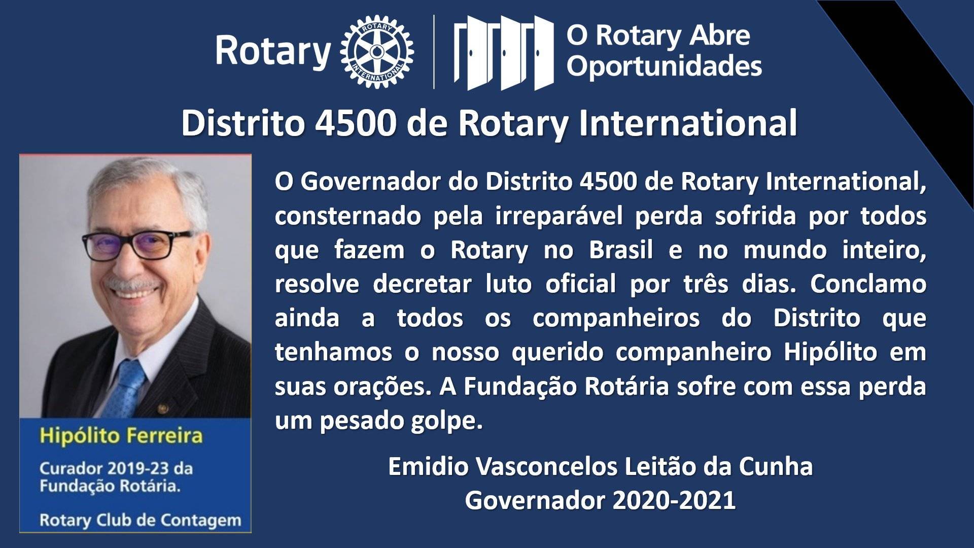 O Governador do Distrito 4500 de Rotary International, consternado pela irreparável perda sofrida por todos que fazem o Rotary no Brasil e no mundo inteiro, resolve decretar luto oficial por três dias. Conclamo ainda a todos os companheiros do Distrito que tenhamos o nosso querido companheiro Hipólito em nossas orações. A Fundação Rotária sofre com essa perda um pesado golpe.