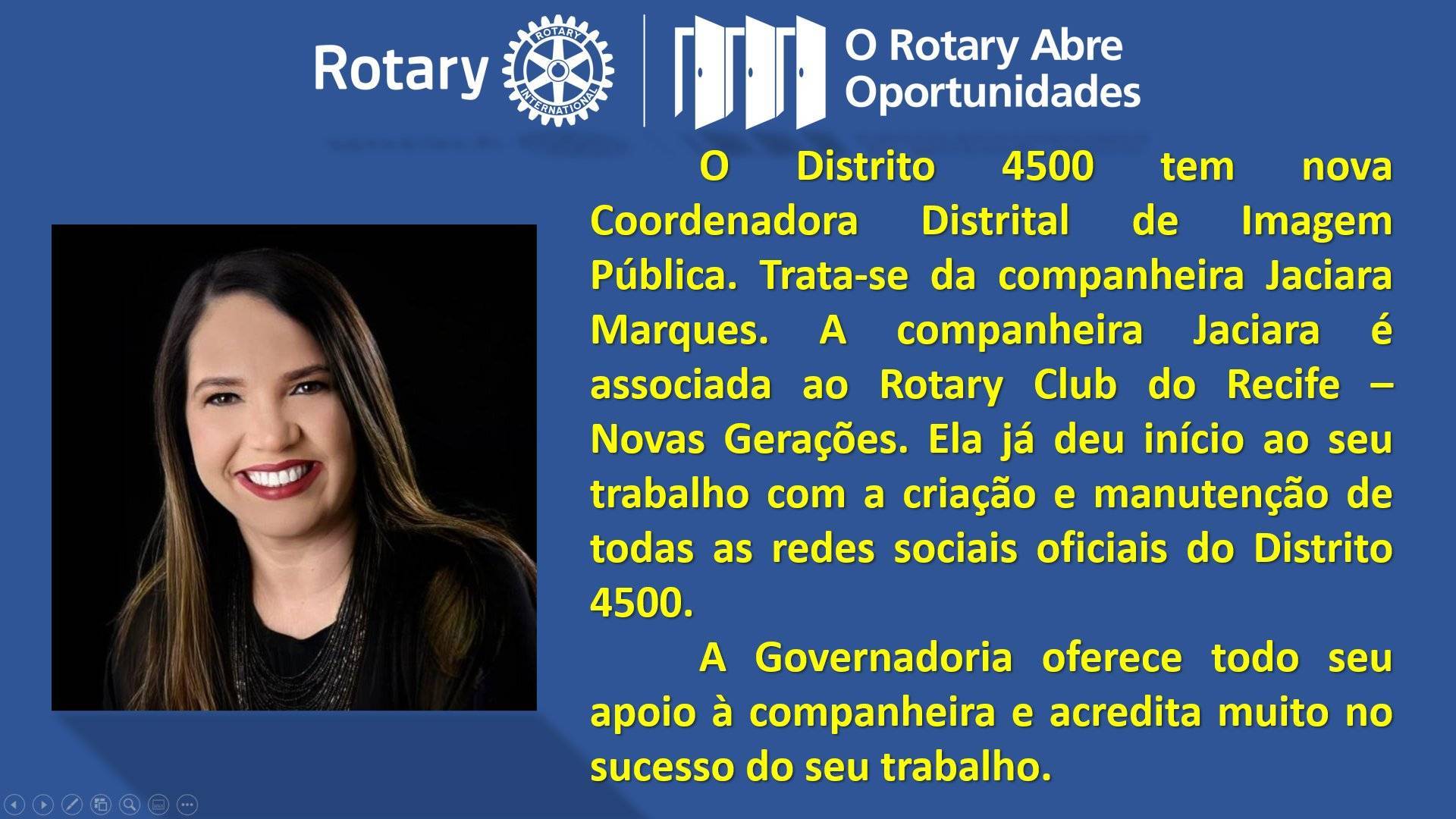 O Distrito 4500 tem nova Coordenadora Distrital de Imagem Pública. Trata-se da companheira Jaciara Marques. A companheira Jaciara é associada ao Rotary Club do Recife – Novas Gerações. Ela já deu início ao seu trabalho com a criação e manutenção de todas as redes sociais oficiais do Distrito 4500.