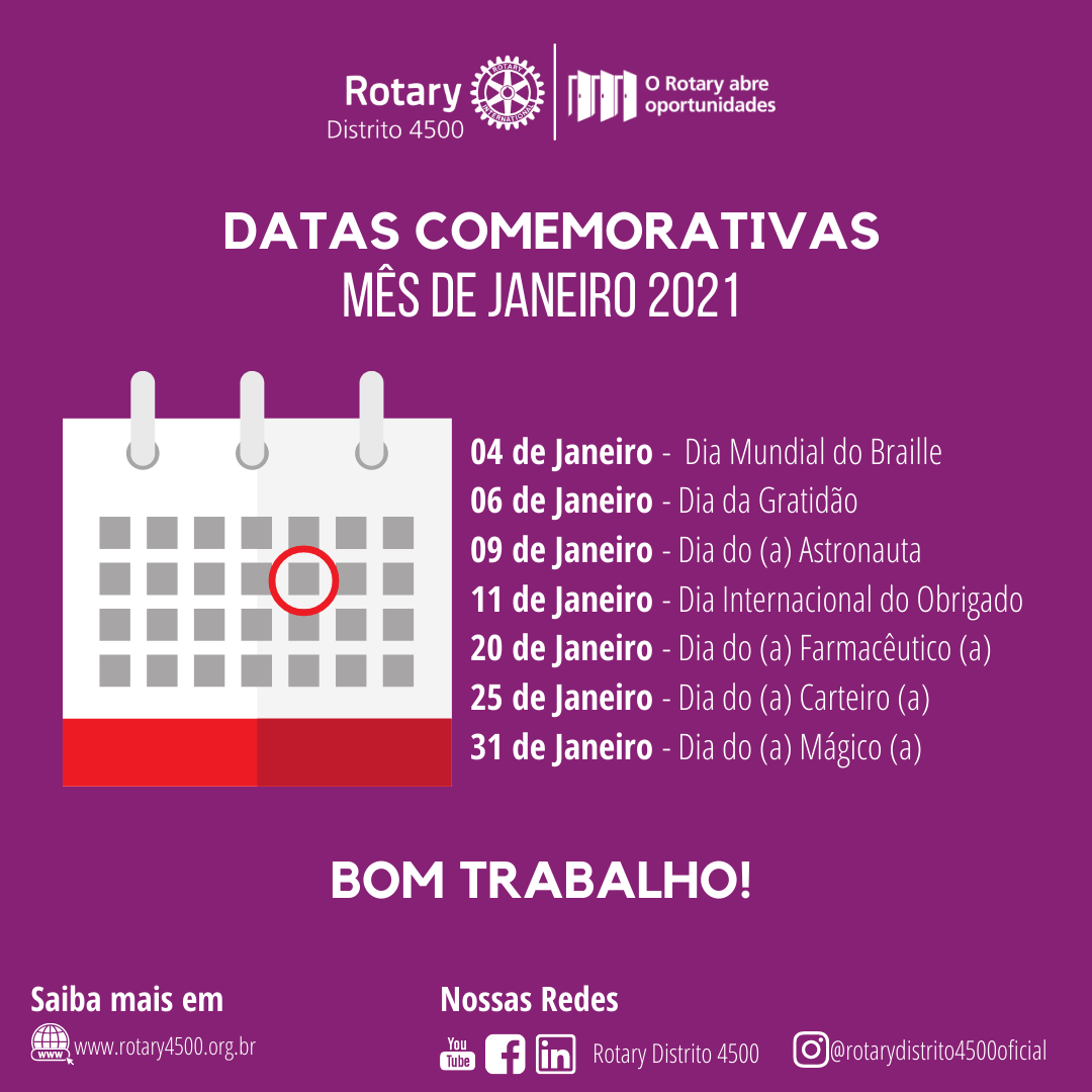 Segue as datas comemorativas do mês de janeiro 2021.