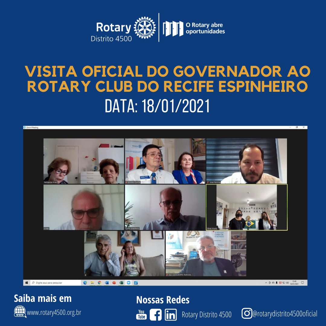 Aconteceu hoje, dia 18 de janeiro, a visita online do Governador Distrital Emídio e a Primeira Dama Auxiliadora ao Rotary Club do Recife Espinheiro.