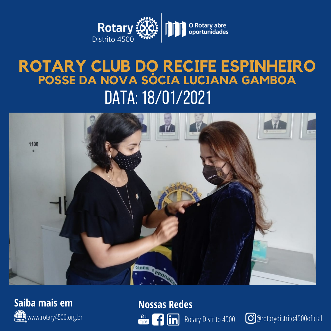 Hoje durante a Reunião do Rotary Club Recife do Espinheiro, foi realizada a posse de nossa Companheira Luciana Gamboa.