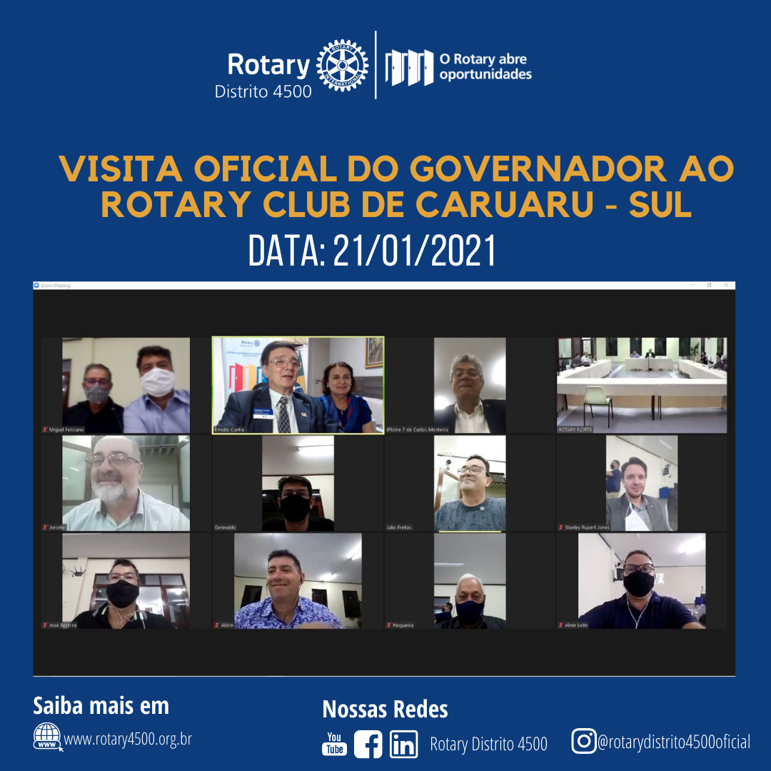 Aconteceu ontem, dia 21 de janeiro, a visita online do Governador Distrital Emídio e da Primeira Dama Auxiliadora ao Rotary Club de Caruaru - Sul