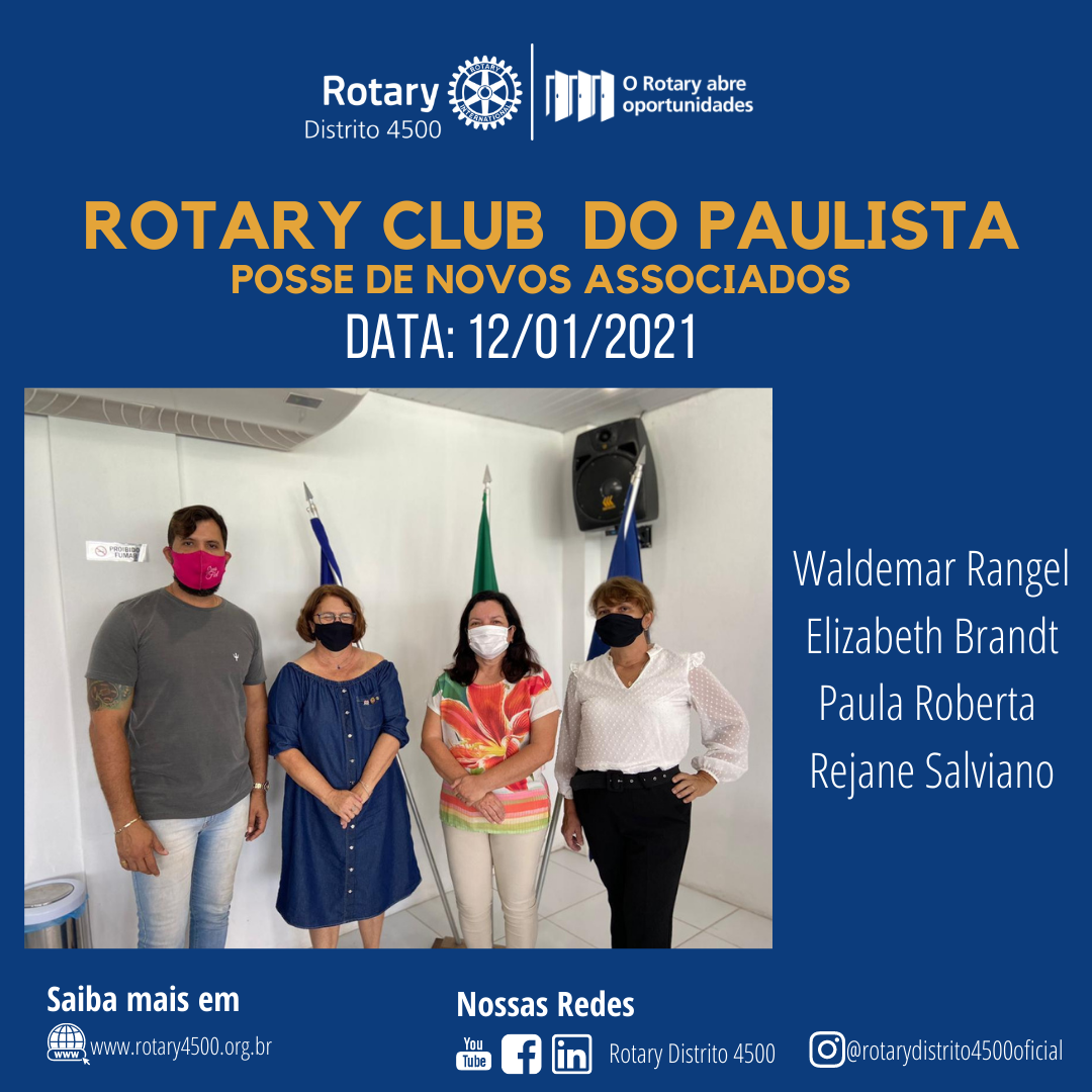 Na reunião Plenária realizada em 12 de Janeiro do Rotary Club do Paulista, foram empossados quatro novos Companheiros, Waldemar Rangel, Elizabeth Brandt, Paula Roberta e Rejane Salviano.