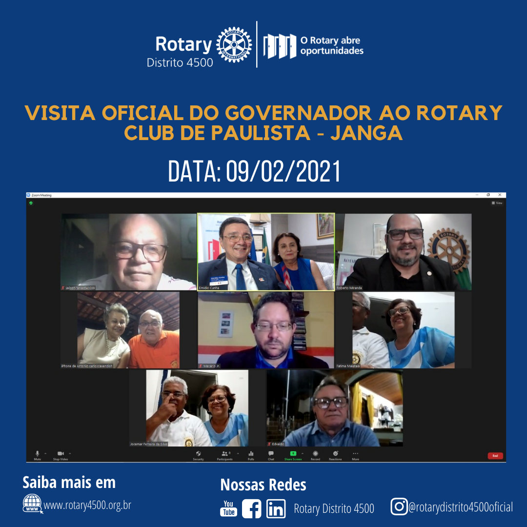 Aconteceu ontem, dia 09 de fevereiro, a visita online do Governador Distrital Emídio e da Primeira Dama Auxiliadora ao Rotary Club de Paulista - Janga.