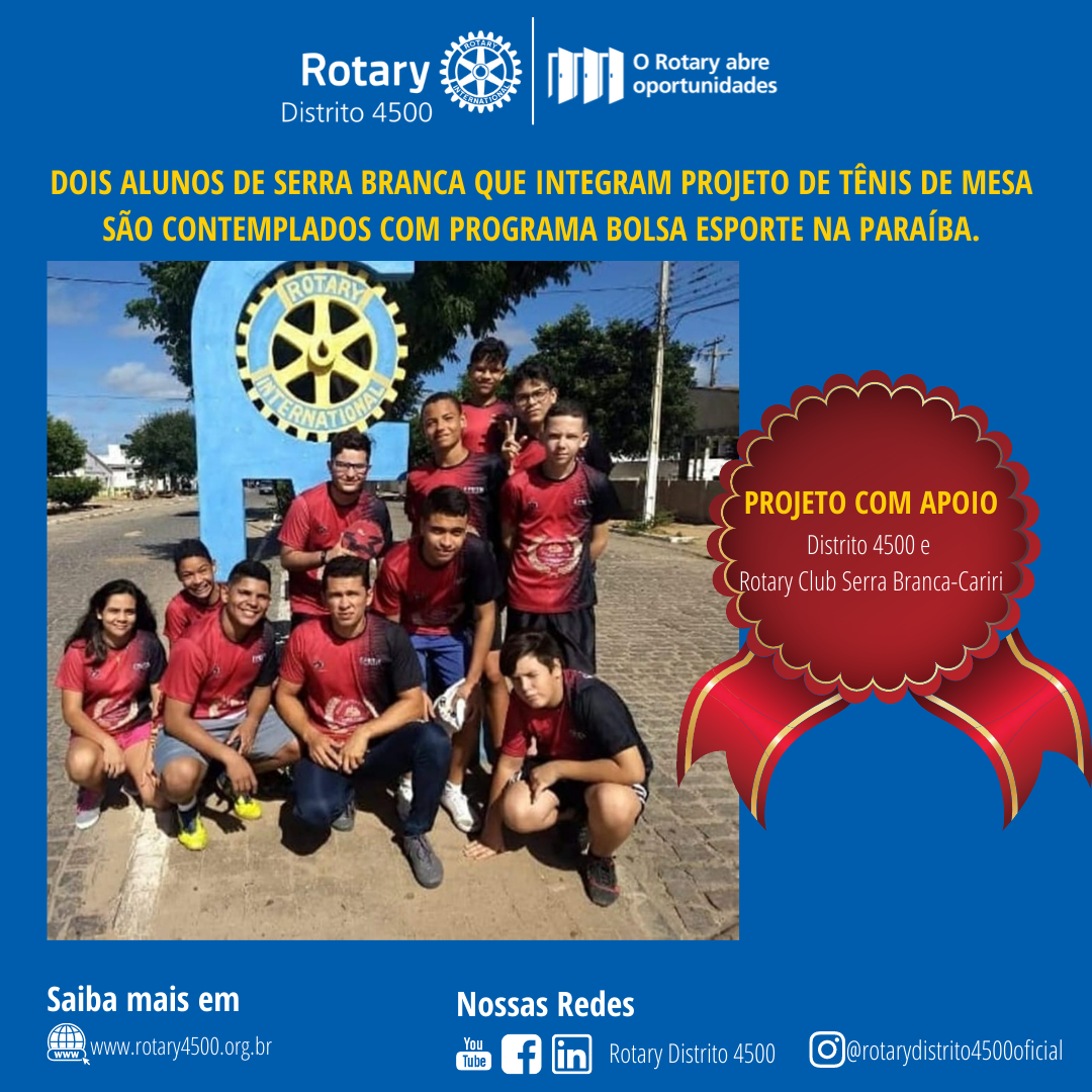 O Projeto ‘Resgatando o Tênis de Mesa’ conta com o apoio do Distrito 4500, Rotary Club Serra Branca-Cariri, Panificadora Vilma LTDA, Rede Supermercado Compre Mais, Laranja Mimo, Gilza Novidades e Inaldo Fotografias que aderiram a causa do projeto.