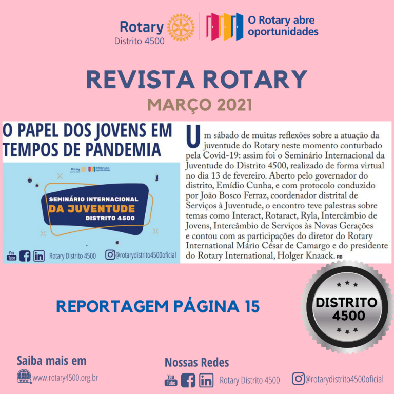 Um sábado de muitas reflexões sobre a atuação da juventude do Rotary neste momento conturbado pela Covid-19: assim foi o Seminário Internacional da Juventude do Distrito 4500, realizado de forma virtual no dia 13 de fevereiro.