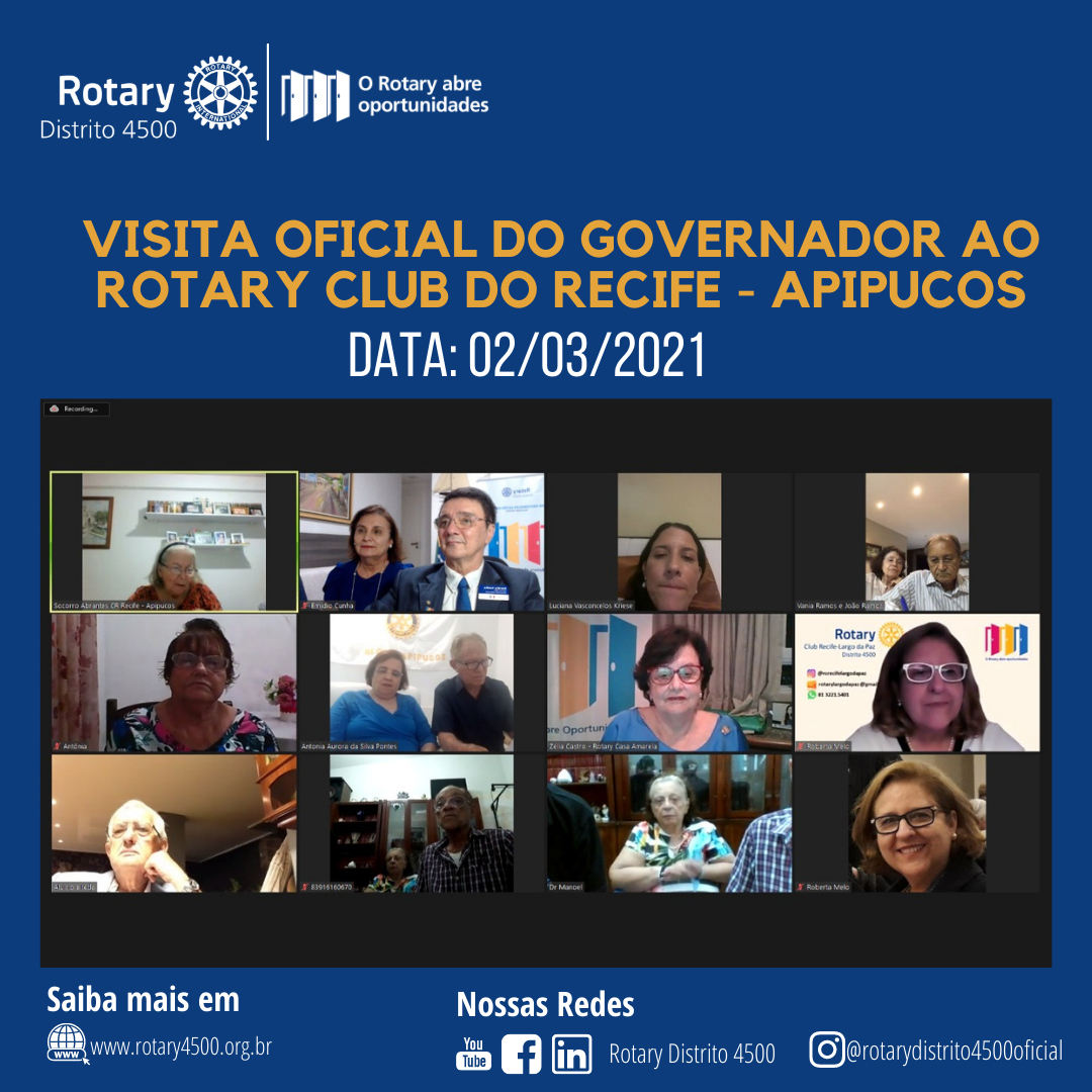 Aconteceu ontem, dia 02 de março, a visita online do Governador Distrital Emídio e da Primeira Dama Auxiliadora ao Rotary Club do Recife - Apipucos.