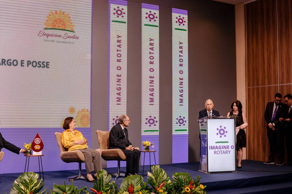 O momento mais esperado da cerimônia, a transmissão do cargo de Governador do Distrito, foi marcado pela descontração e clima de companheirismo. Primeiro, o casal padrinho de Elequicina em Rotary, Sylvia e Onofre Lopes Jr., fizeram uma bonita homenagem, falando sobre as contribuições e participação de sua afilhada em Rotary. Tivemos também as palavras do Governador 2021-22 Gilson Edmar, com um resumo sobre o que foi feito em sua gestão e o oferecimento de seu apoio a gestão que ora se inicia. O momento oficial da posse ocorre com a troca de pins entre os Governadores 2021-22 e 2022-23, seguido do juramento feito pela Governadora Elequicina. Em seguida, há o discurso da Governadora, o qual ressaltou sua gratidão ao trabalho dos governadores distritais anteriores, que mantiveram o distrito coeso e atuante, apesar das dificuldades, e também enfatizou os direcionamentos do Rotary International para a gestão que se inicia. Tivemos ainda a entrega do banner oficial da gestão pela RDR 2022-23 Yanca Monique e a entrega da bandeira do Distrito 4500, que ficará na sede da Governadoria atual até a próxima gestão.