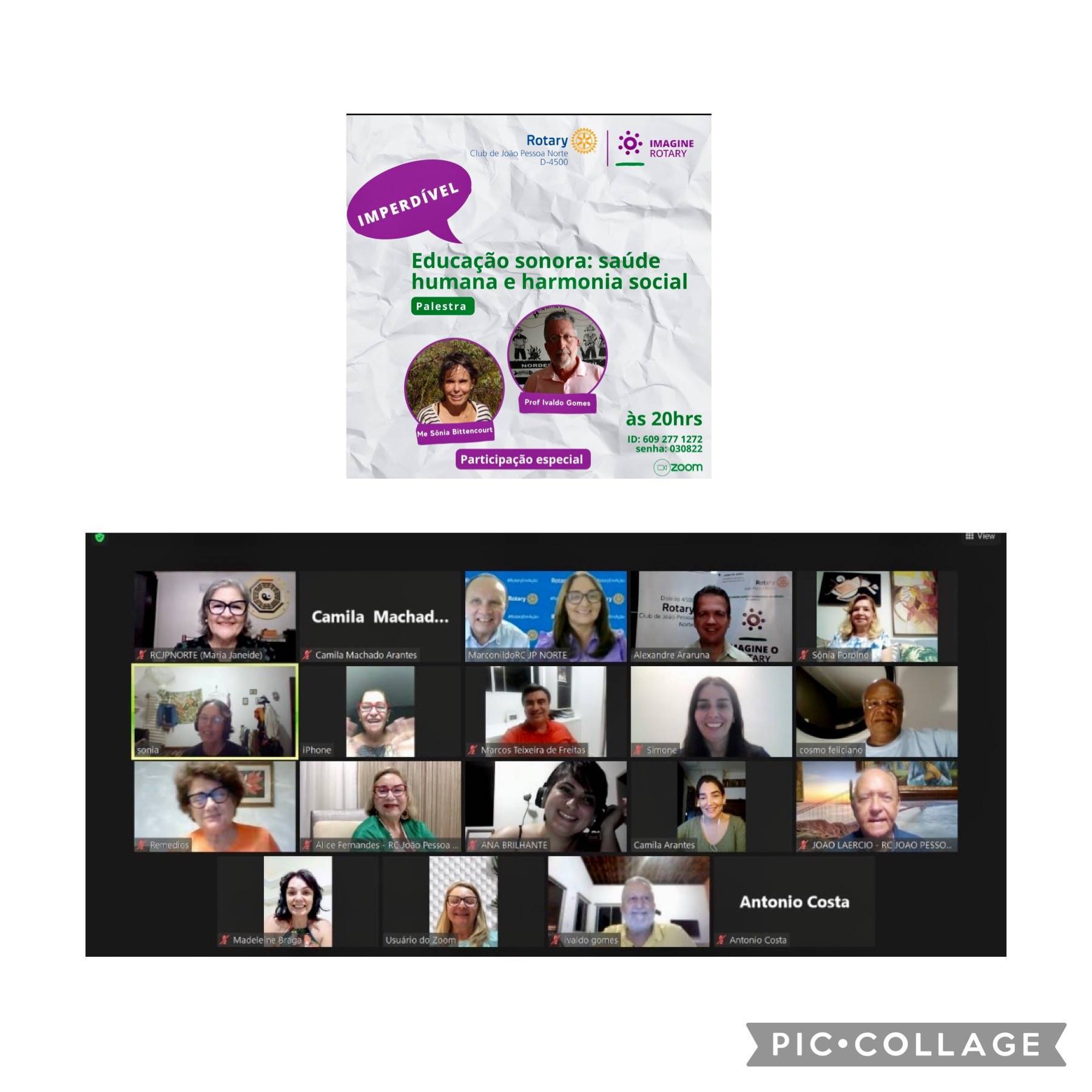 A quinta reunião ordinária do Rotary Club de João Pessoa Norte, ano rotário 2022-2023, presidida pelo Presidente Alexandre Araruna, foi enriquecida pela excelente palestra “Educação Sonora: Saúde humana e harmonia social” proferida pela Mestra Maria Sônia Bittencourt e o professor Ivaldo Gomes, ambos membros da ONG CDMA - Coletivo em Defesa do Meio Ambiente da Paraiba.