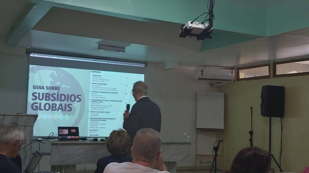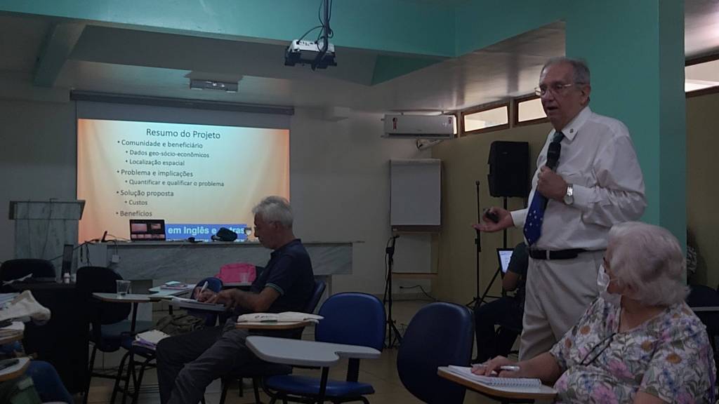 Na sequência, a turma foi dividida em três grupos, os quais trabalharam, cada um, uma proposta diferente para projeto de subsídio global. Nesta primeira etapa, os grupos elaboraram resumos simplificados para descrição de seus projetos. O Governador Júlio Lóssio aproveitou para destacar a importância de os resumos conterem informações precisas sobre: a localização espacial do projeto (é importante podermos localizar no Google Maps a localidade onde o projeto será desenvolvido); a quantificação de pessoas atingidas/impactadas; o valor do projeto (sempre expresso em dólares, observando o valor mínimo para projetos de subsídios globais, que é de US$ 30,000).