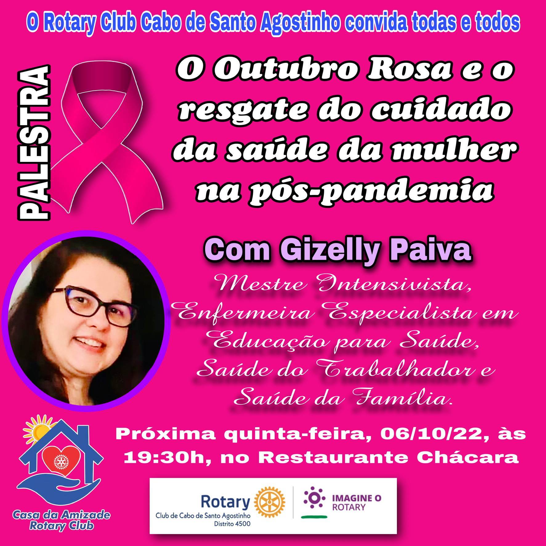 Um dos eventos promovidos pelo clube foi a palestra proferida por Gisele Paiva, Coordenadora Municipal de Políticas de Saúde da Mulher. O tema abordado, "O Outubro Rosa e o resgate do cuidado da saúde da mulher na pós-pandemia", trouxe reflexões importantes sobre os impactos da pandemia nas práticas de cuidado com a saúde feminina e destacou a necessidade de retomar a atenção a essa questão.