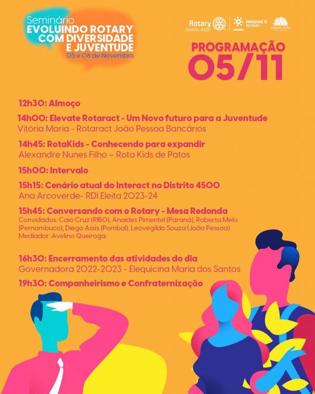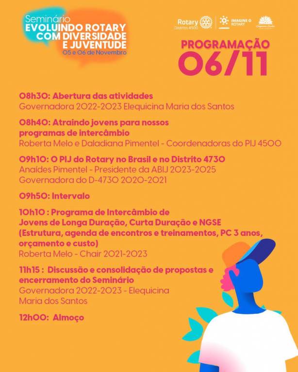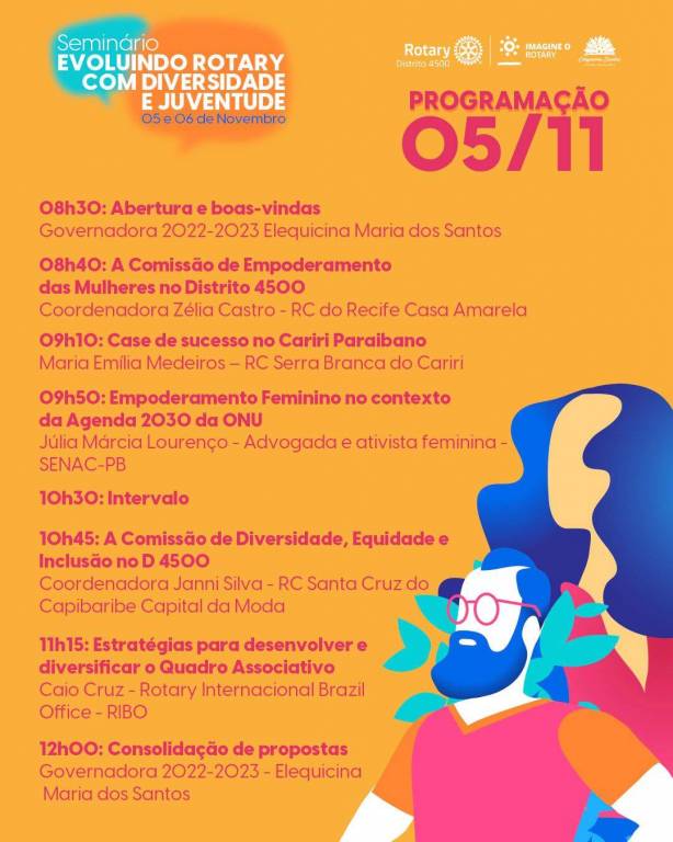 Será um evento voltado para os assuntos relacionados a Diversidade, Equidade e Inclusão e Juventude. Teremos a presença da equipe de intercâmbio, Rotaract, Interact, além de espaços abertos para debates e mesa redonda.