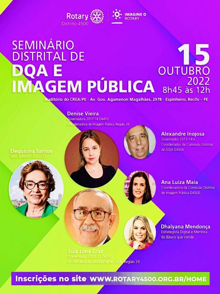 O Rotary Club Cabo de Santo Agostinho participou do Seminário Distrital , promovido pelo Distrito 4500, que tem à frente a GD Elequicina Santos, biênio 2022/23, onde se teve ricas orientações no tema, através de especialistas em QDA e IMAGEM PÚBLICA, como: Denise Vieira Governadora 2017-18 D4410 Coordenadora de Imagem Pública Região 29, Alexandre Inojosa Governador 2013-14 e Coordenador da Comissão Distrital de DQA D4500, Ana Luiza Maia Coordenadora da Comissão Distrital de Imagem Pública D4500, Dhalyana Mendonça