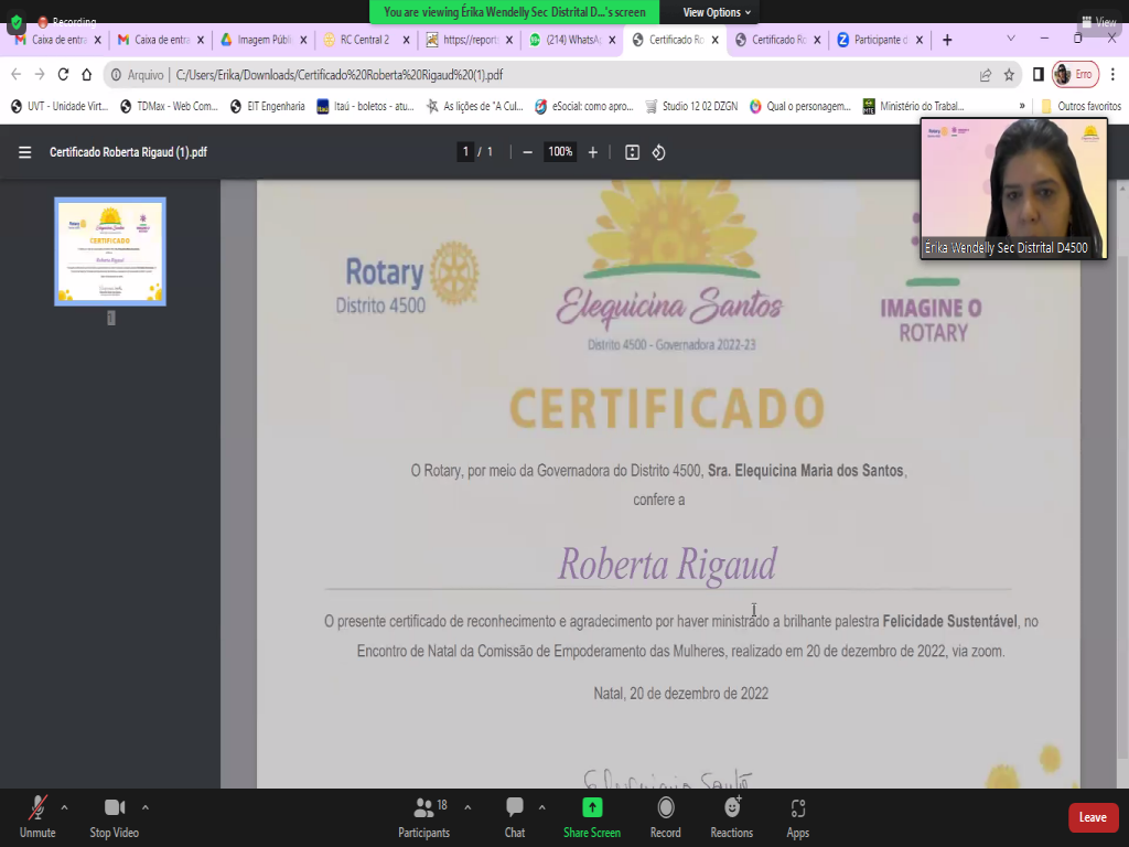 Gratidão à Roberta por conduzir esse encontro de forma tão agradável e esclarecedora, e também à companheira Zélia Castro, nossa coordenadora distrital, pela realização deste evento. Que o ano de 2023 nos traga mais ocasiões de encontro e troca de experiências. O Rotary também nos traz essa maravilha que é a ampliação dos conhecimentos, por meio do encontro com pessoas inspiradoras. Só temos a agradecer!