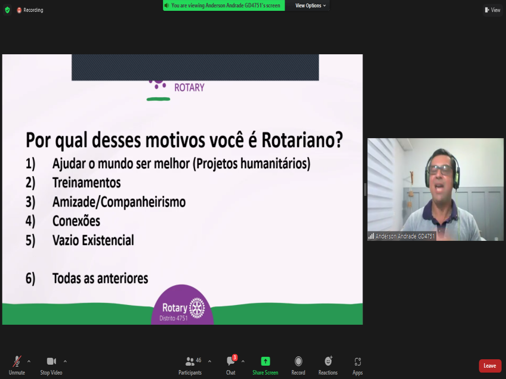 O Governador Anderson deu uma excelente palestra, elencando diversos motivos que o mantém no Rotary, destacando seis: ajudar o mundo a ser melhor (projetos humanitários); treinamentos; amizade/companheirismo; conexões; preencher o vazio existencial. O carisma, empatia e positividade do Governador Anderson motivam todos nós a nos dedicarmos ainda mais a esta grandiosa instituição que é o Rotary.