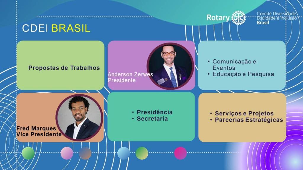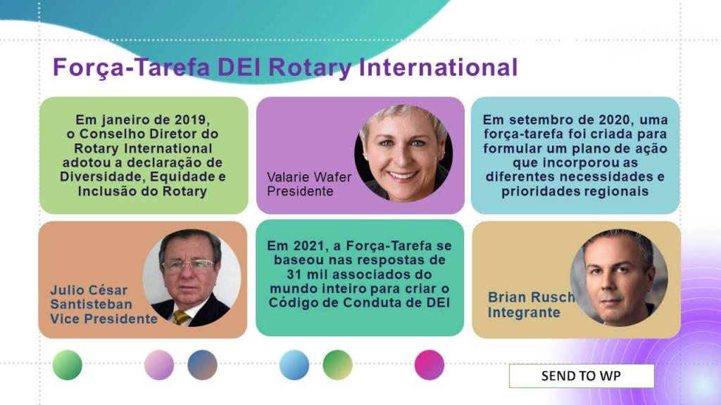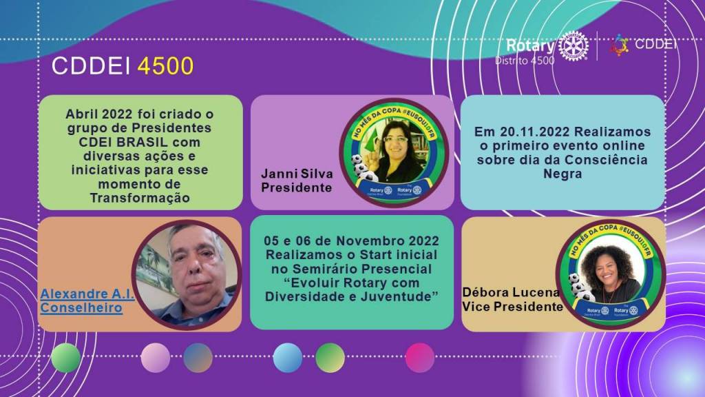 Foram abordados vários temas sobre D.E.I. novas práticas, novos hábitos, novos comportamentos para algo que é FATO e que a partir da forma como tratamos, obteremos sucesso na implantação/aperfeiçoamento de D.E.I. em cada clube, e sempre honrando e respeitando a nossa história em Rotary e o tempo e ritmo de cada Rotariano(a) engajados nesses novos desafios.