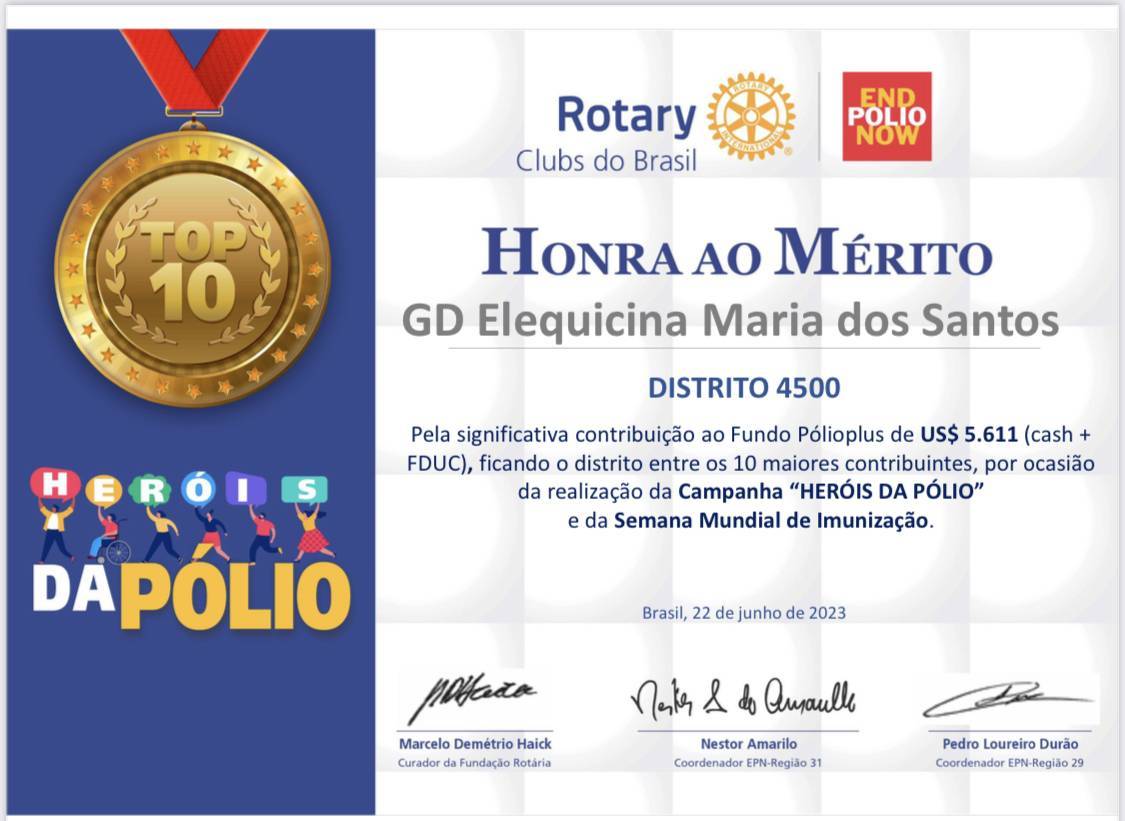 O Distrito 4500 ficou no TOP 10 distritos do Brasil que mais contribuíram para o Fundo Pólio Plus na Campanha Herois da Pólio! A Governadora Elequicina Santos agradece a todos(as) os(as) companheiros(as) que colaboraram p/ este feito. É um orgulho saber que contribuímos p/ a erradicação da poliomielite no mundo! Somos #PessoasEmAção