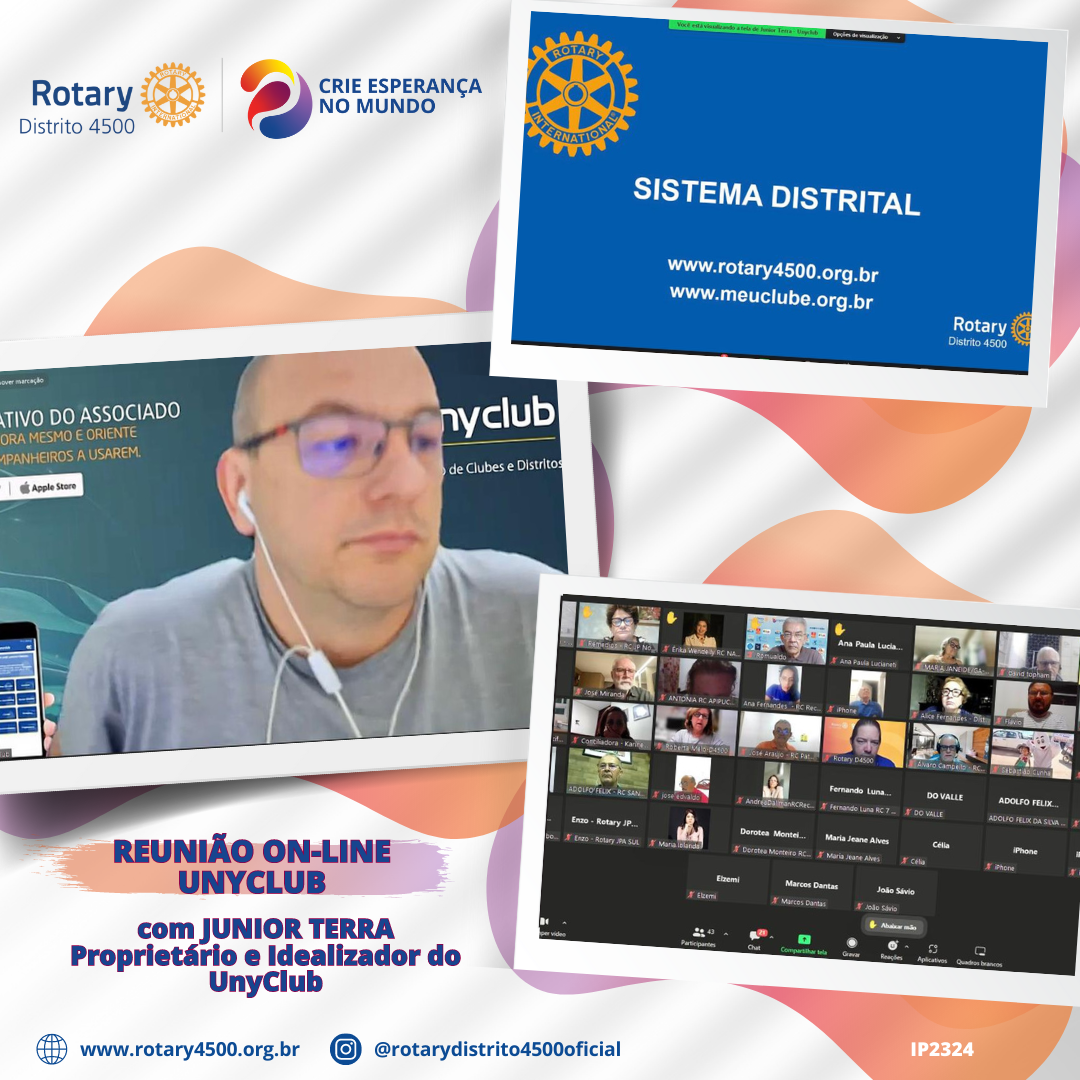 O Distrito 4500 realizou na última quinta-feira (3) reunião on-line sobre o sistema UNYCLUB com o companheiro do Distrito 4640, Júnior Terra. O objetivo do encontro foi o de divulgar e incentivar os clubes a utilizarem o sistema como ferramenta de gestão, passando a alimentar as informações dos clubes no sistema.