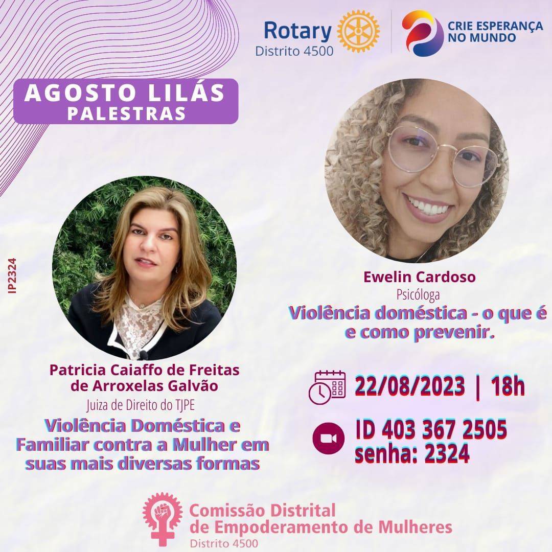 A Comissão de Empoderamento de Mulheres do Distrito 4500, realizará no dia 22 de agosto, as palestras Violência Doméstica e Familiar contra a mulher em suas mais diversas formas com Patrícia Caiaffo de Freitas de Arroxelas Galvão, Juíza de direito do TJ PE e Violência Doméstica – o que é e como prevenir com Ewelin Cardoso, psicóloga.