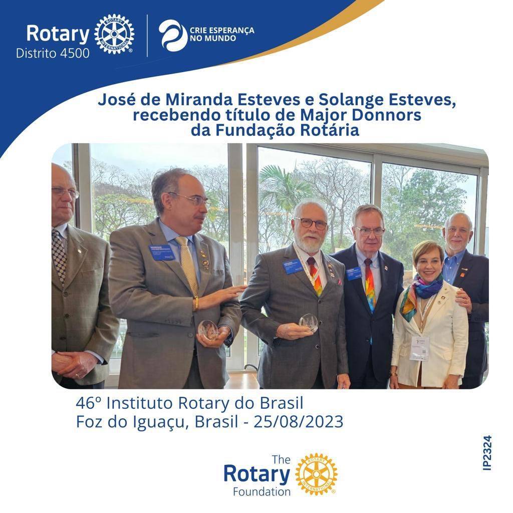 Durante o 46° Instituto Rotary do Brasil, em Foz do Iguaçu, foi realizada mais uma edição do tradicional almoço em homenagem aos Major Donors, ocasião em que o Governador José de Miranda Esteves e sua esposa Solange receberam o título de Doadores Extraordinários da Fundação Rotária.