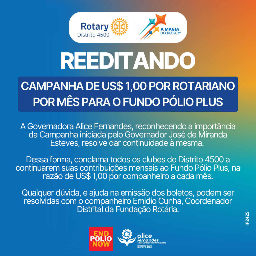 Em um gesto de continuidade e compromisso com a erradicação da poliomielite, a Governadora do Distrito 4500, Alice Fernandes, decidiu manter viva a campanha "US$ 1,00 por rotariano por mês" em apoio ao Fundo Pólio Plus. Iniciada pelo ex-Governador José de Miranda Esteves, a campanha visa mobilizar todos os clubes do distrito para contribuir com um dólar por mês por cada rotariano, reforçando a importância de uma participação contínua e coletiva.