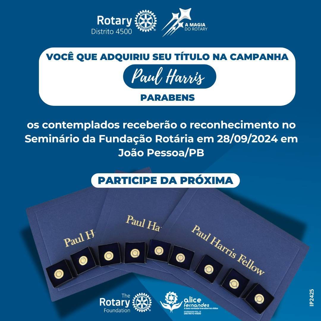 Os rotarianos que adquiriram o título Paul Harris durante a campanha promovida recentemente pelo Distrito 4500 serão homenageados no Seminário da Fundação Rotária, a ser realizado em 28 de setembro de 2024, em João Pessoa/PB.