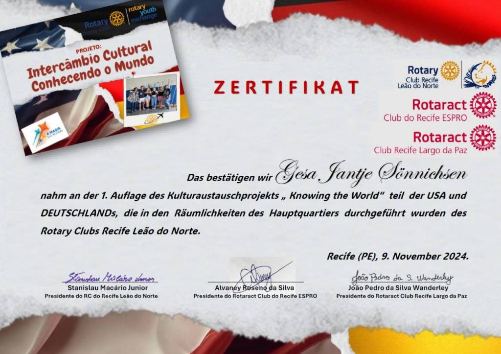 No último dia 09 de novembro, o Rotary Club do Recife Leão do Norte com o apoio dos Rotaract Clubs Recife ESPRO e Recife Largo da Paz, além do Intercâmbio de Jovens do Distrito 4500, pôde realizar um de seus sonhos de projeto em sua sede, através da 1ª edição do Intercâmbio Cultural: Conhecendo o Mundo, que trouxe nessa edição, através de sorteio, a exposição de dois países (Estados Unidos e Alemanha) representados por 04 intercambistas que expuseram as tradições locais através da cultura, arte e até da culinária, onde foram preparados “na hora” para que todos os presentes pudessem prestigiar o preparo de pratos típicos de cada país.