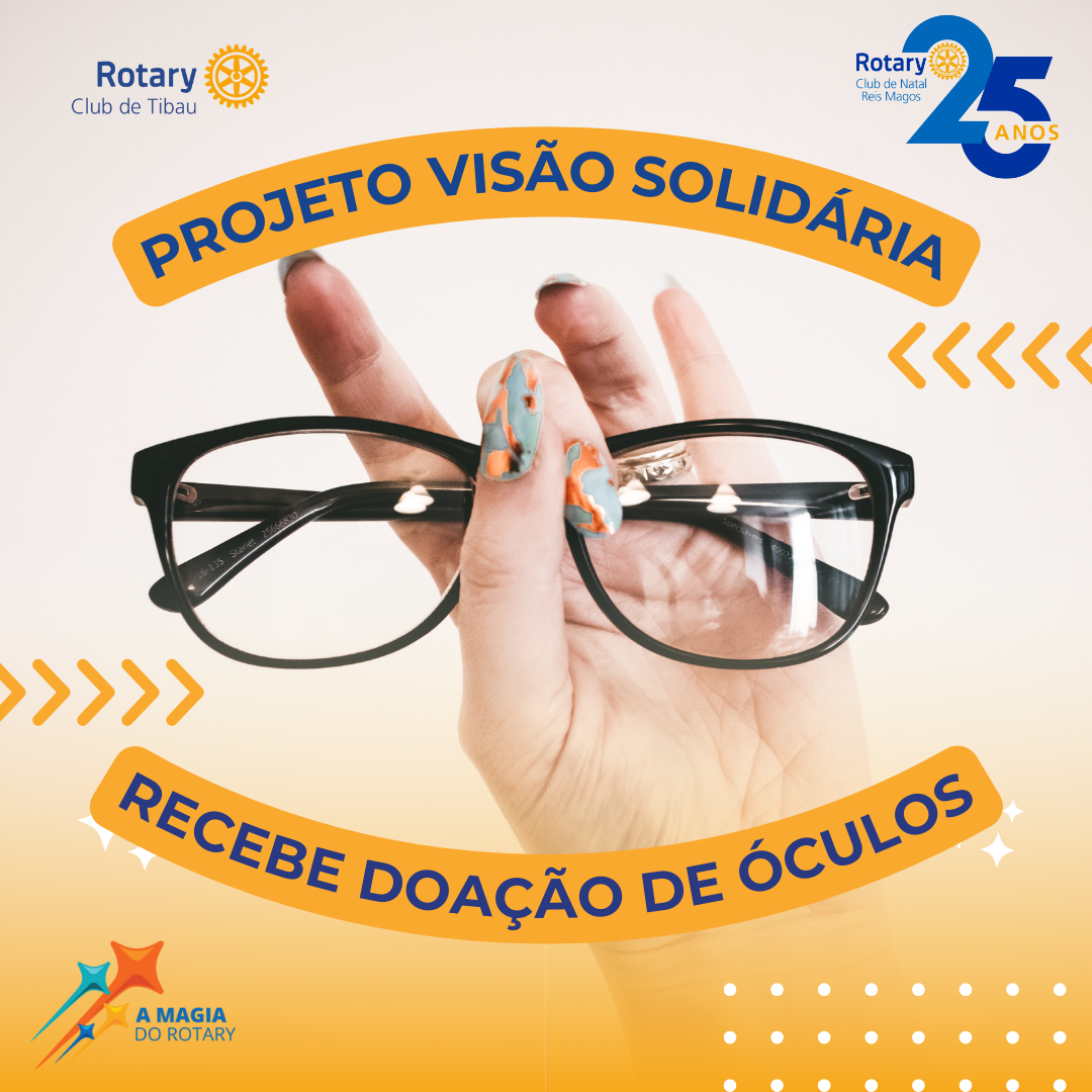 Estamos recebendo doação de óculos com armações em bom estado, para destinar ao Projeto Visão Solidária, em parceria com o Rotary Club de Tibau. O Projeto Visão Solidária atende crianças e jovens, realizando consultas oftalmológicas gratuitamente e entregando os óculos para aqueles que necessitam.