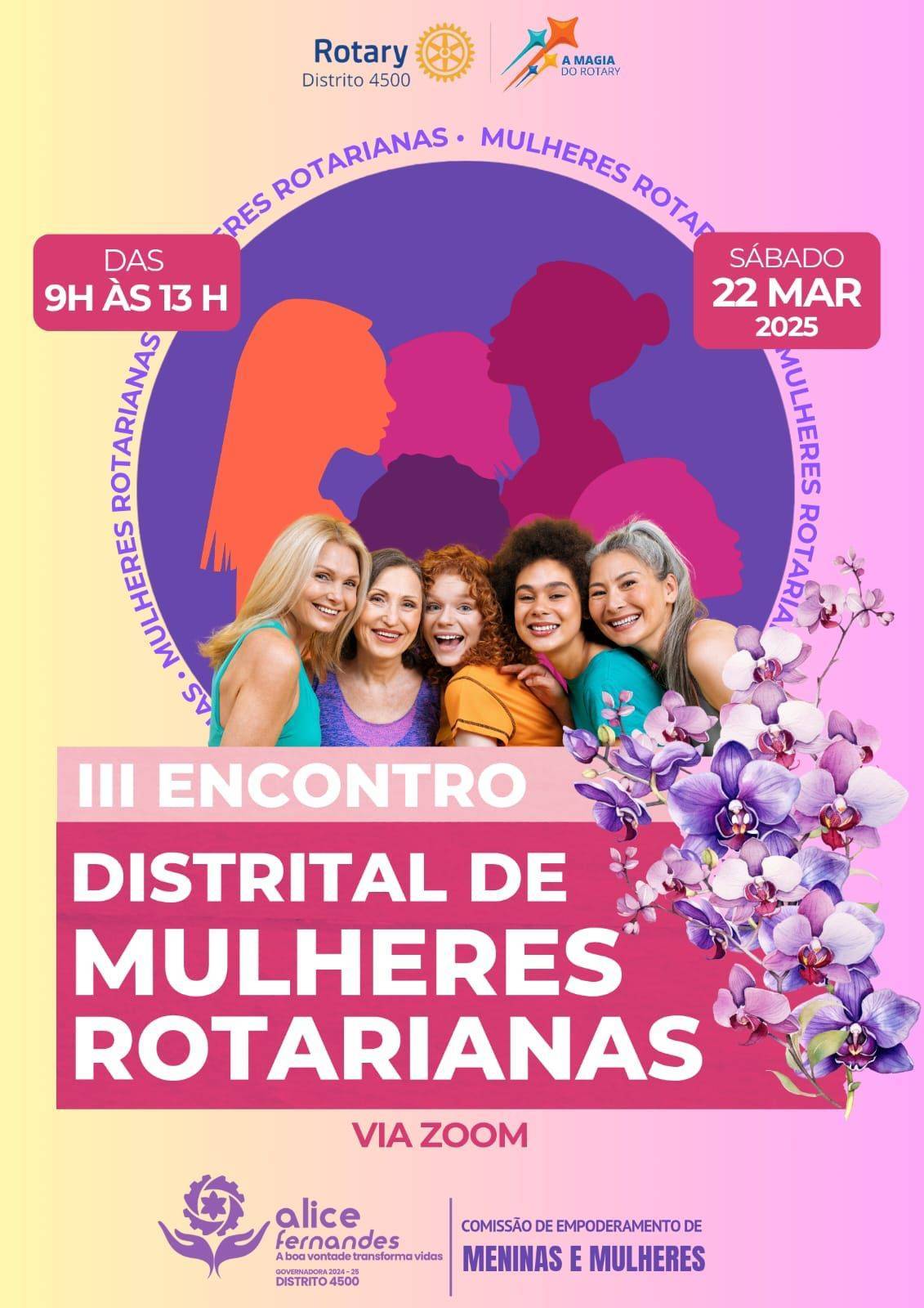 No dia 22 de março de 2025, das 9h às 13h, será realizado o III Encontro Distrital de Mulheres Rotarianas, promovido pelo Distrito 4500 e pela Comissão de Empoderamento de Meninas e Mulheres. O evento, que acontecerá de forma online via Zoom, proporcionará um espaço de conexão, troca de experiências e fortalecimento do protagonismo feminino dentro do Rotary.