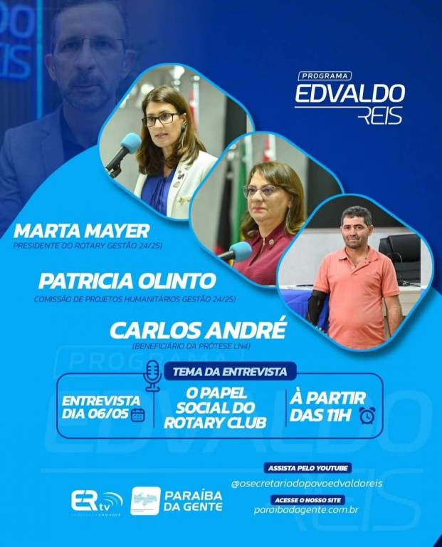 Nesta terça-feira (06), o programa Edvaldo Reis recebeu representantes do Rotary Club de Monteiro para uma entrevista especial sobre o impacto social das ações desenvolvidas pela instituição no Cariri paraibano. Em destaque, o projeto “Mãos Solidárias”, que promove a doação de próteses de mão para pessoas em situação de vulnerabilidade social.