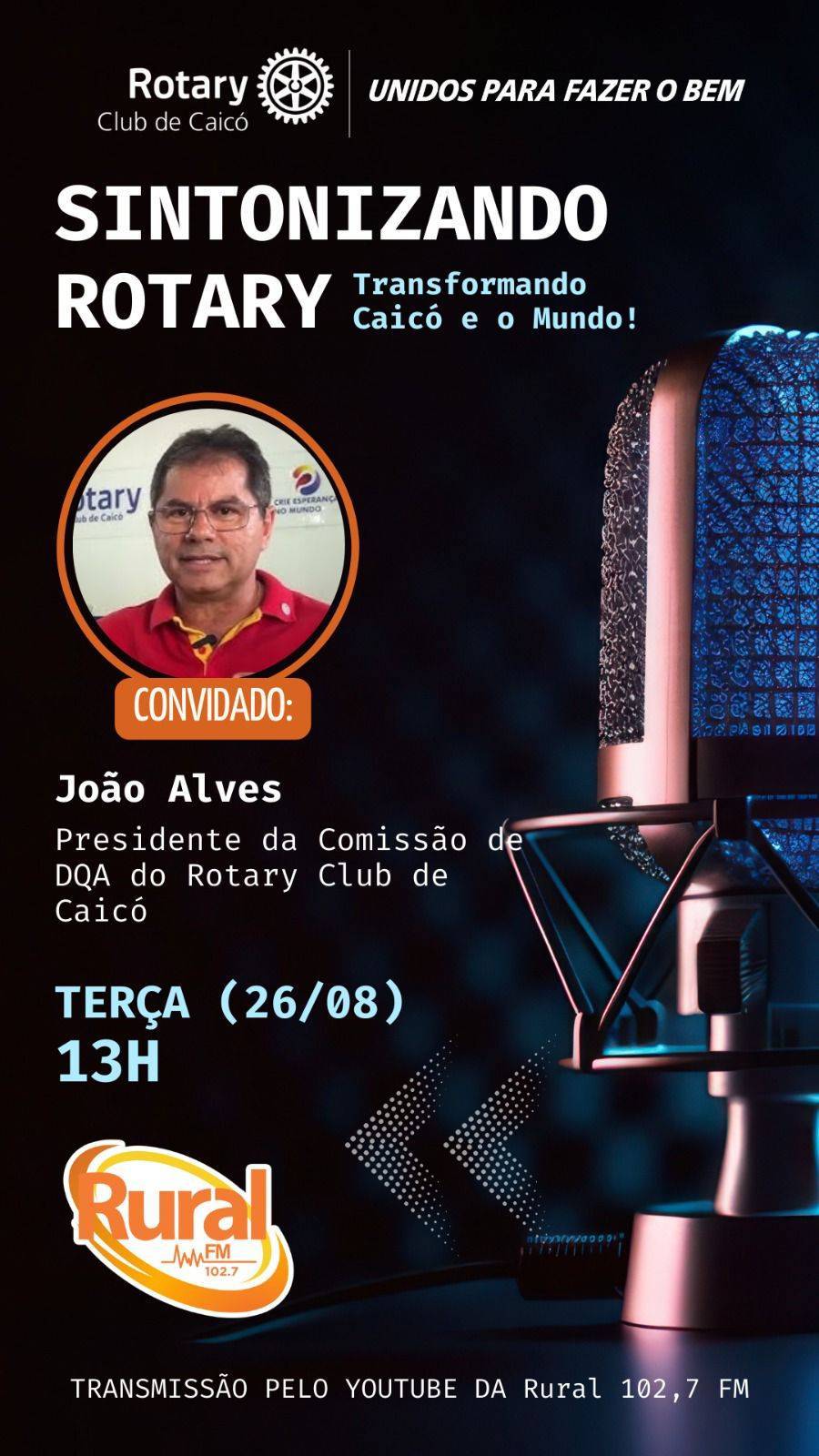 O programa Sintonizando Rotary: Transformando Caicó e o Mundo estreia nesta terça-feira, 26 de agosto, às 13h, na Rádio Rural 102,7 FM, com transmissão também pelo YouTube da emissora. A iniciativa é do Rotary Club de Caicó e contará com entrevistas, informações e debates sobre as ações sociais e comunitárias desenvolvidas pela instituição.