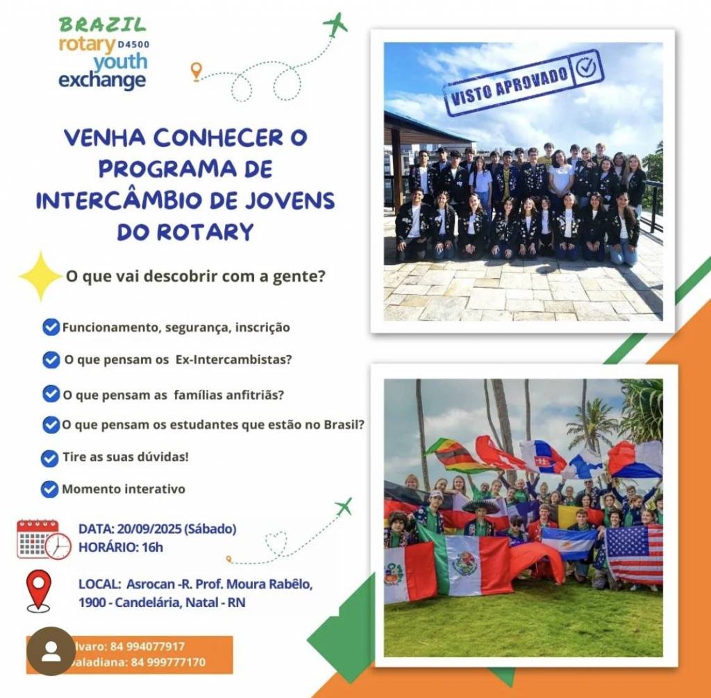 E tem mais: as inscrições já estão abertas! Não perca essa chance! Marque na agenda e venha descobrir como o intercâmbio do Rotary transforma vidas.
