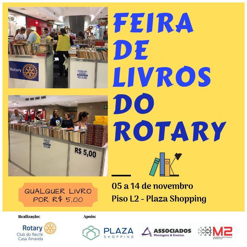 O Rotary Club do Recife - Casa Amarela promove feira de livros em Shopping da cidade do Recife. Nessa feira, qualquer livro pode ser comprado por R$ 5,00.