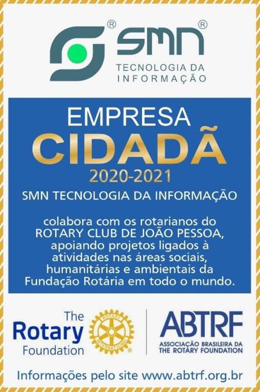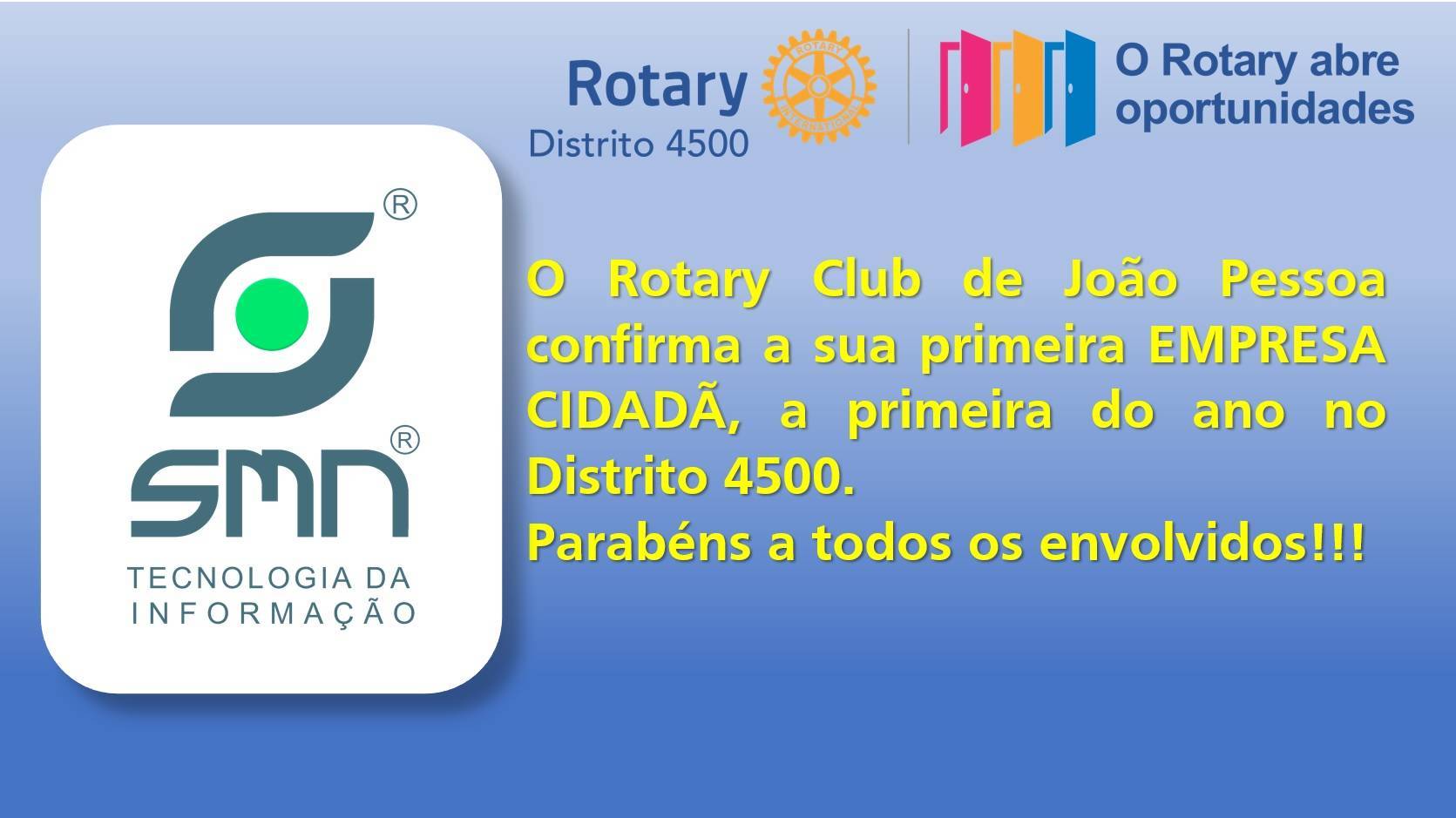 O Rotary Club de João Pessoa conseguiu nesse início de ano rotário captar a sua primeira EMPRESA CIDADÃ. Trata-se da SMN Tecnologia da Informação LTDA. A SMN se comprometeu a doar US$ 1.000,00 (Mil Dólares) para a Associação Brasileira da The Rotary Foundation (ABTRF).