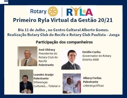 No dia 1 de julho, o Rotary Club do Recife em parceria com o Rotary Club de Palista - Janga realizou o primeiro RYLA virtual da história do Distrito 4500. O evento foi realizado no Centro Cultural Alberto Gomes, atingindo 50 jovens na manhã de um sábado inspirador que contou , por vezes , com a participação dos próprios jovens , que respondiam as perguntas e tiravam dúvidas durante  as palestras dos companheiros: José Ubiracy Silva, Leandro Araújo e o Companheiro Albery Freitas. O  RYLA foi organizado pela Equipe Distrital de Comissão do Ryla Ana Fernandes – Presidente da Comissão Distrital de Ryla, associada ao Rotary Club do Recife e Albery Freitas, associado ao Rotary Club Paulista Janga.
