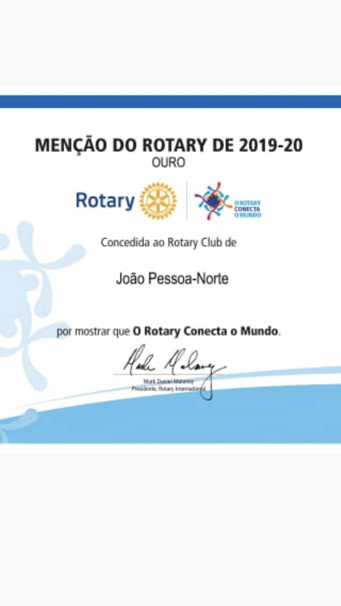 Rotary Internacional concedeu Menção Ouro ao RC João Pessoa Norte por mostrar que o Rotary Conecta o Mundo ao cumprir e registrar as metas previstas para o Ano Rotário 2019-2020 sob a presidência da companheira Sheyla Sodré.